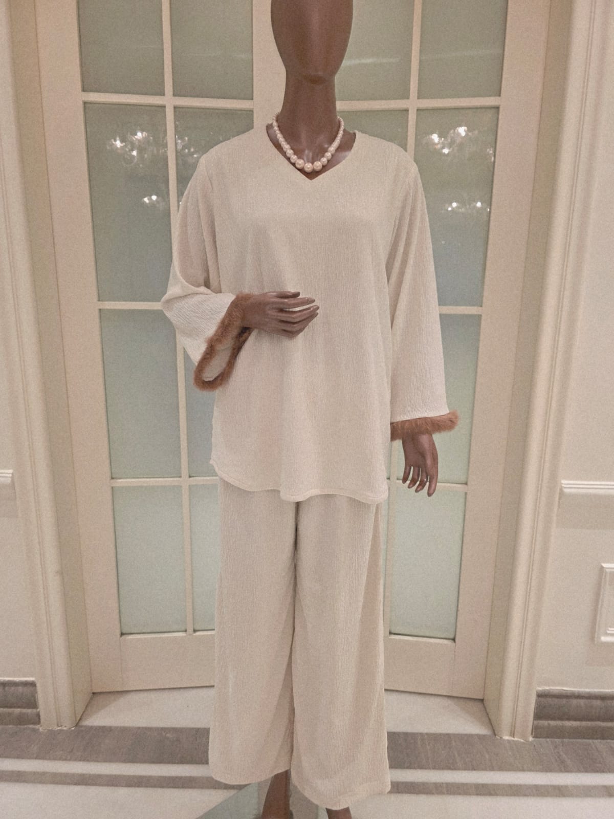 Soft, effortless, and elevated — the Cloud Set is your go-to for clean, modern dressing. Made from a lightweight crushed gota weave fabric in pure white, it brings a breathable, airy feel with a structured silhouette. The fur lace detailing on the sleeve head adds a gentle touch of texture, keeping the look polished yet relaxed. Perfect for brunches, casual meetings, or any moment you want to feel put-together without trying too hard.