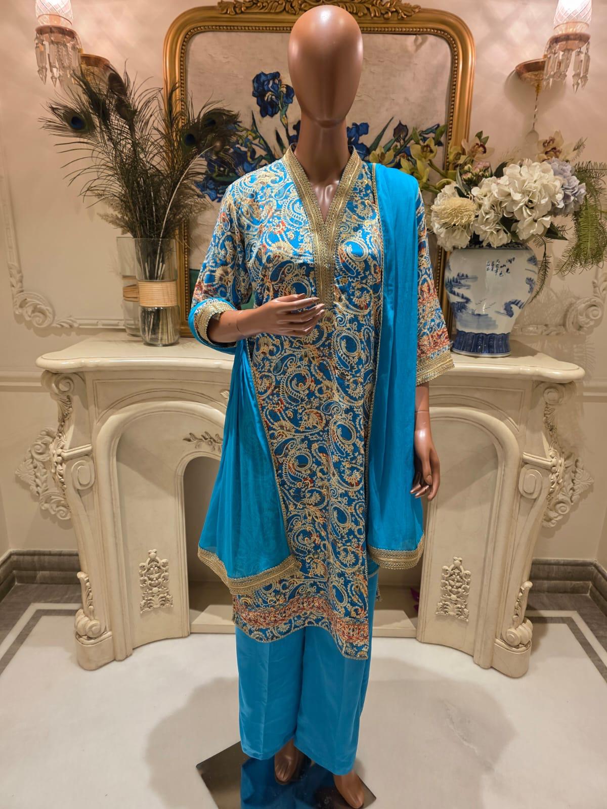 Step into timeless charm with this elegant blue suit set, designed for those who adore subtle detailing. The neckline and dupatta borders are beautifully adorned with delicate lace, adding a graceful touch to the rich blue hue. Perfect for day-to-evening wear, this ensemble blends simplicity with understated luxury.