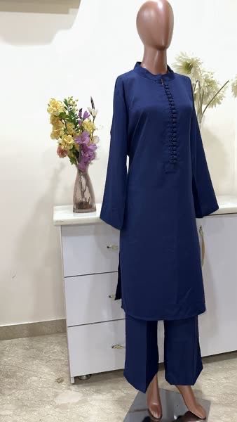 This is a long, solid-colored tunic, likely in a deep blue hue. It features a mandarin collar and a placket that extends down the front, adorned with a series of decorative fabric-covered buttons or knots. The sleeves are long and appear to be slightly flared at the cuffs. The overall style is simple yet elegant, suggesting a comfortable and sophisticated garment.
