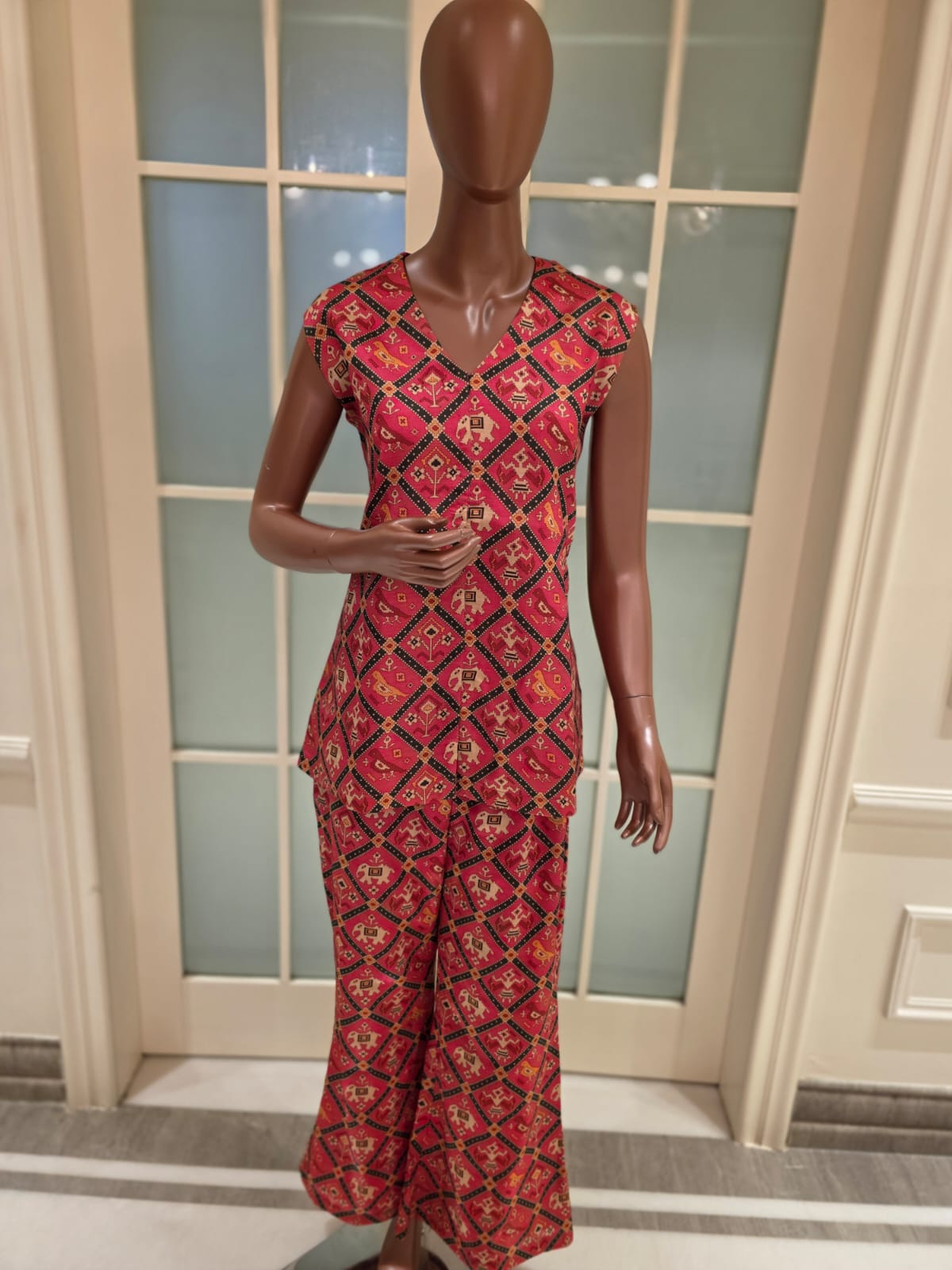Make a bold style statement with our Patola Poise cordset, crafted in rich Patola silk and adorned with vibrant heritage-inspired prints. The luxurious texture of the fabric complements the fluid silhouette, while the bell-bottom pants add a touch of retro glam. Designed for comfort and charm, this set comes with sleeves — making it versatile for both festive gatherings and elevated everyday wear. A perfect blend of tradition and trend.