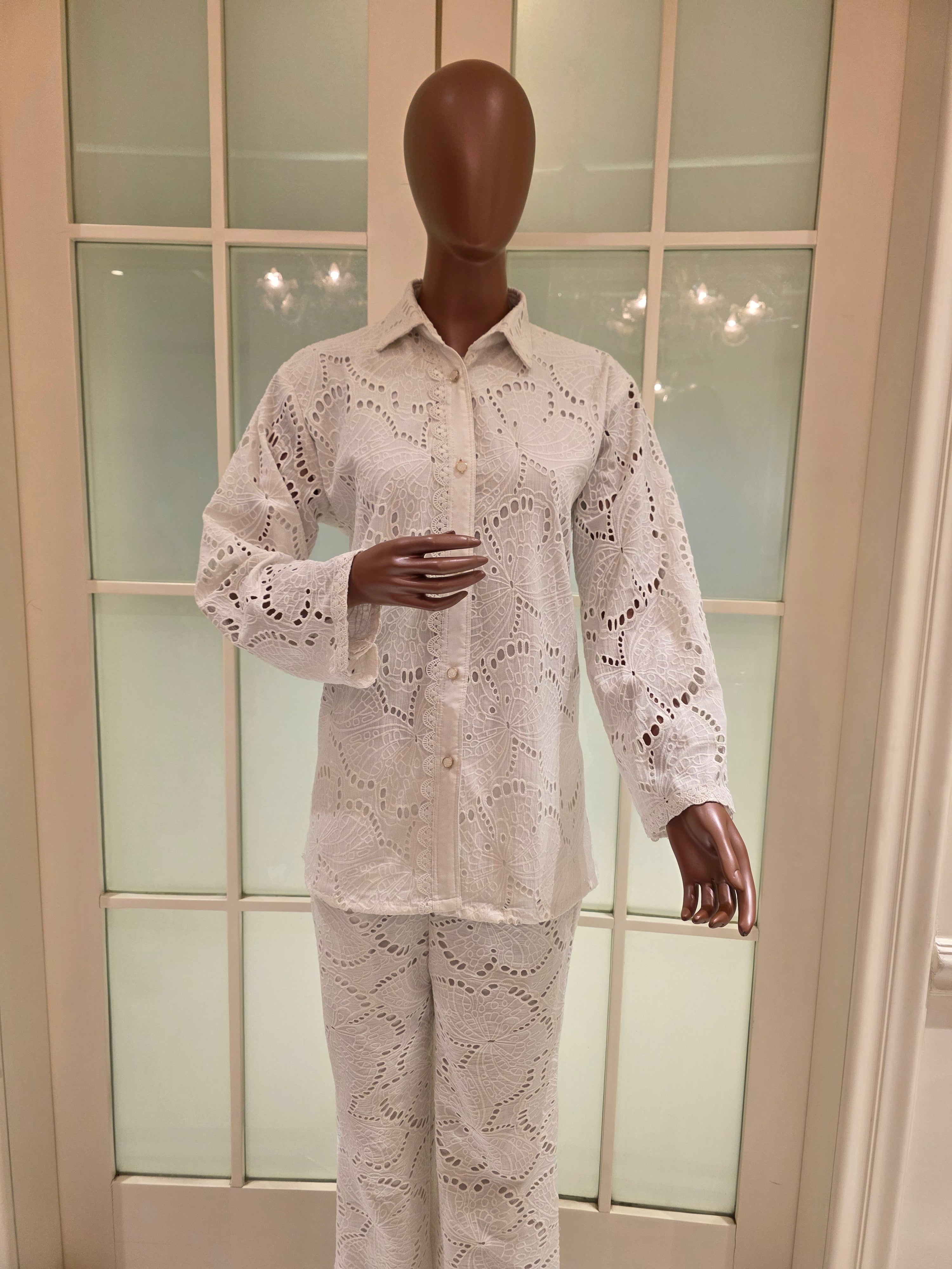 Embrace understated sophistication with our pristine white tunic and trouser set. The delicate floral embroidery dances across the fabric, adding a touch of artisanal charm. Crafted for comfort and style, this ensemble offers a refined silhouette perfect for both relaxed days and special occasions.