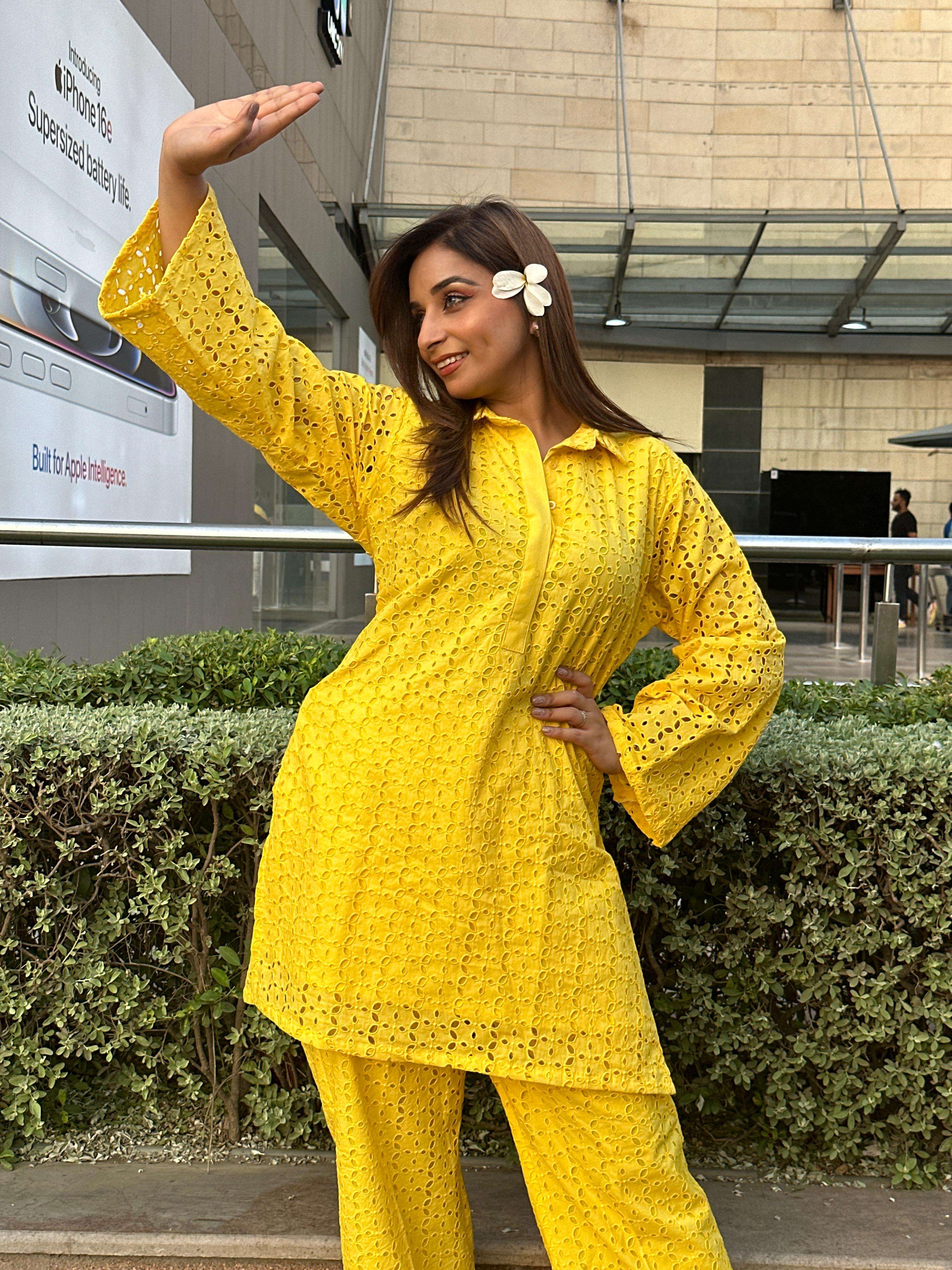 This vibrant Yellow cord set features a striking white geometric print, offering a contemporary twist on classic style. The relaxed top and wide-leg trousers are crafted for comfort, making it a chic choice for both casual and semi-formal occasions.